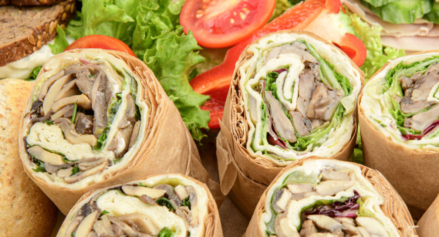 - Mini wrapy z kurczakiem i warzywami – lekkie, poręczne i bardzo efektowne. Co więcej, można je przygotować w wersji klasycznej lub wege.