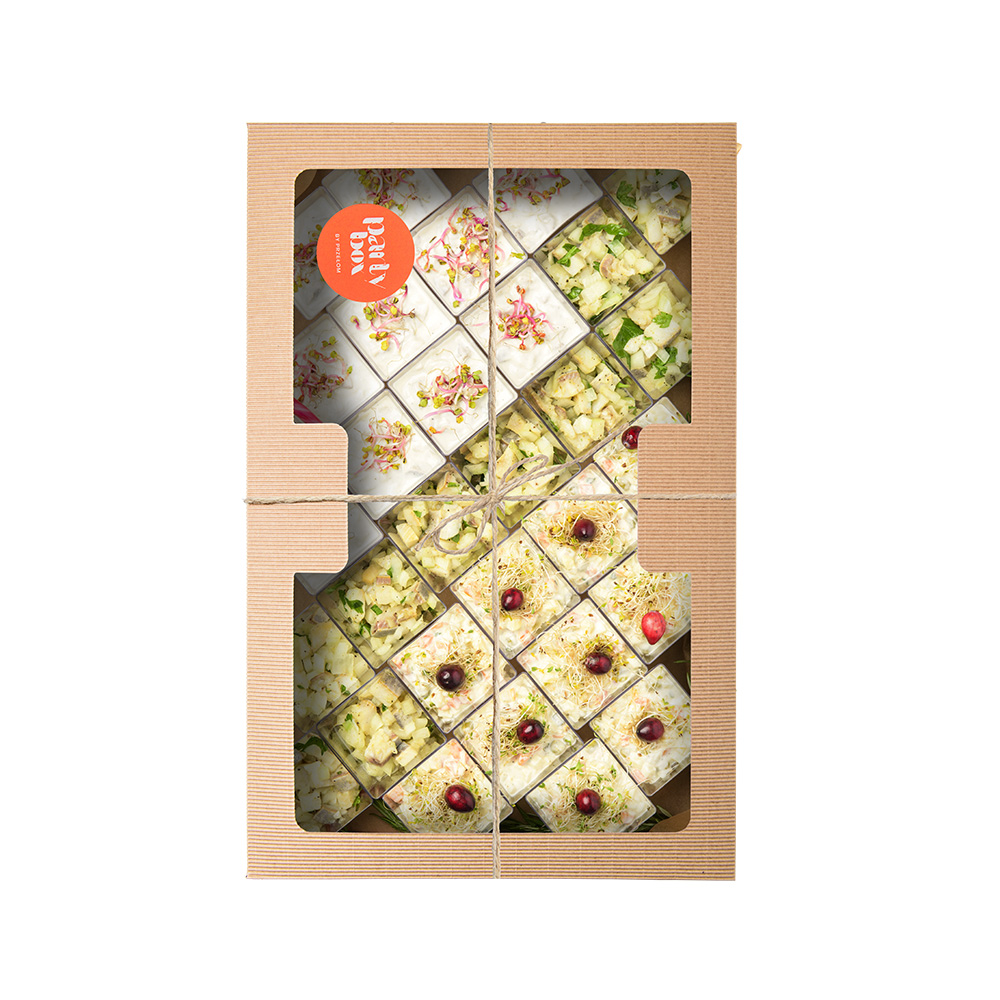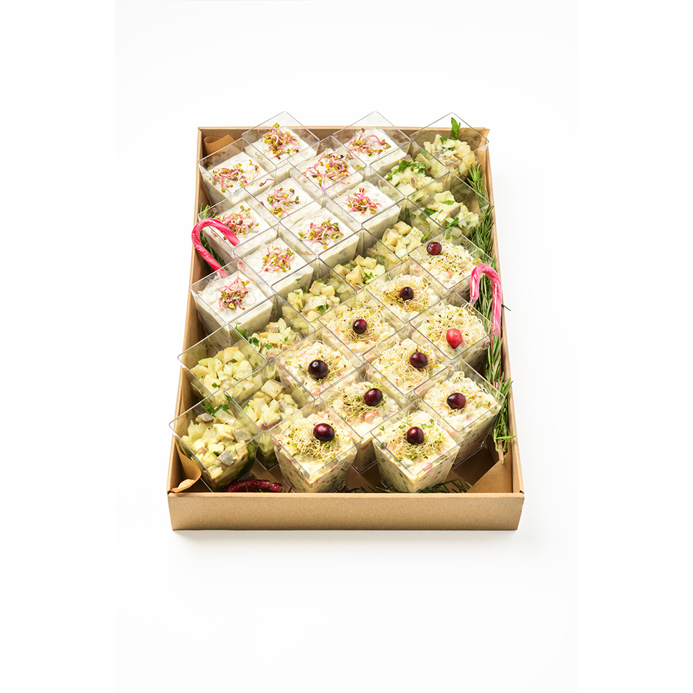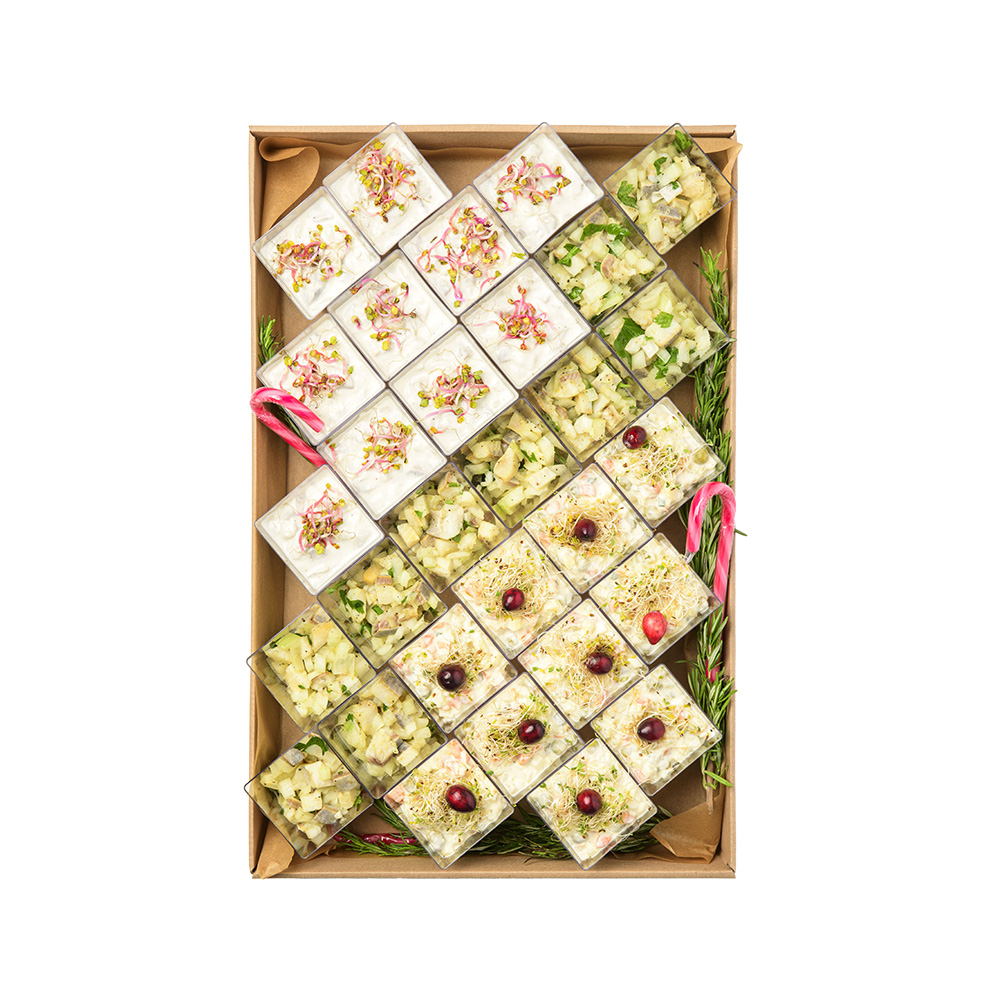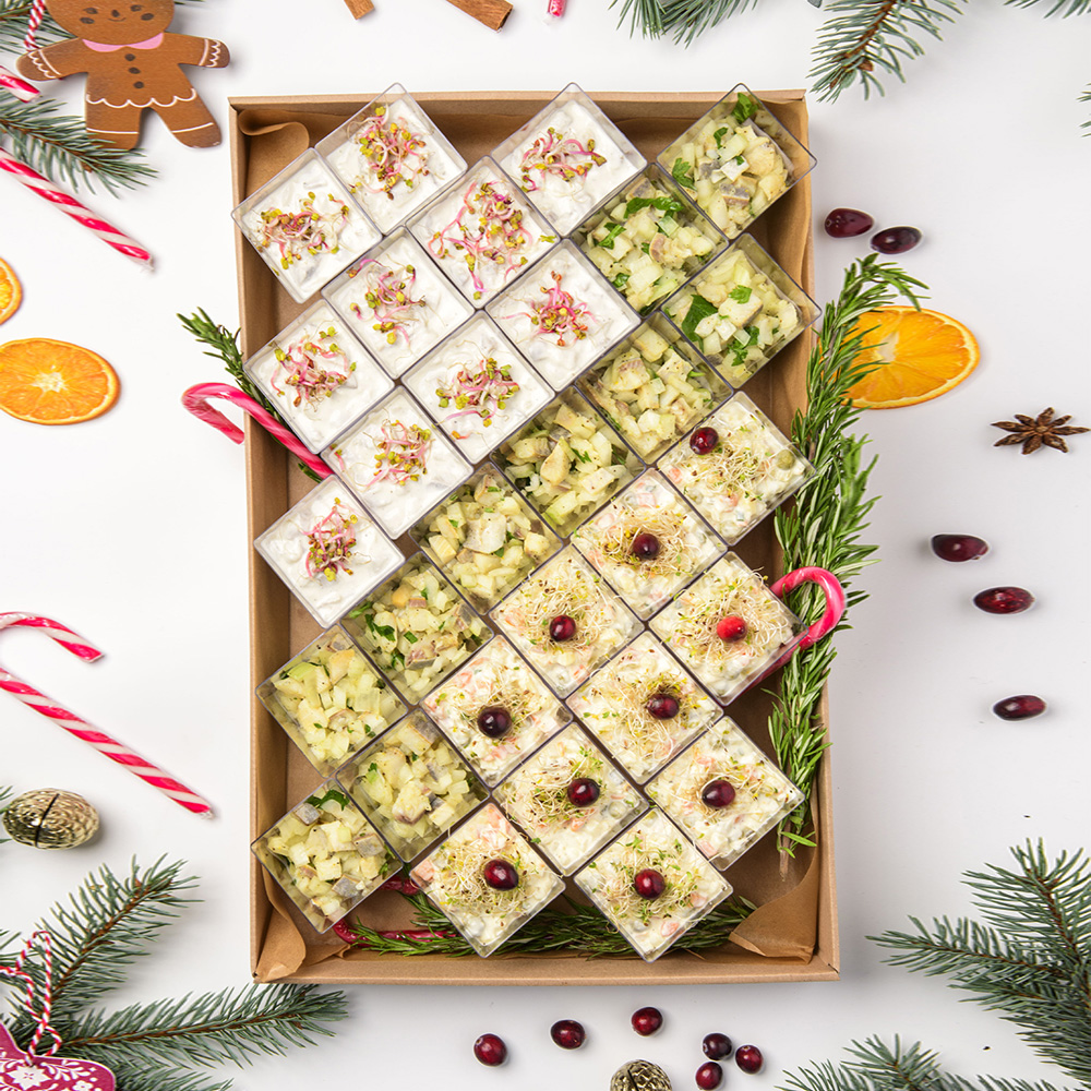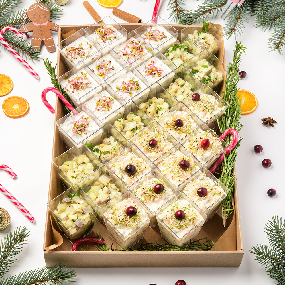 Christmas Finger Mix Box to wyjątkowy zestaw klasycznych, świątecznych przystawek, który pozwala w prosty sposób przygotować efektowny stół. Każda porcja została starannie przygotowana z najwyższej jakości składników i podana w formie wygodnych finger food. Dzięki temu box sprawdzi się zarówno na firmowych wigiliach, jak i rodzinnych spotkaniach czy przyjęciach w świątecznym klimacie.