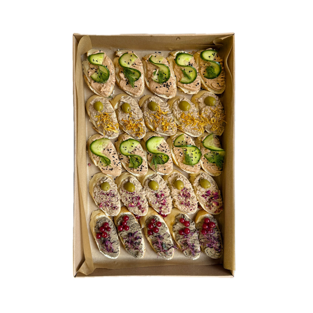W boxie znajdziesz 25 sztuk mini kanapek w trzech dopracowanych kompozycjach smakowych. Dbamy o różnorodność, dlatego zestaw pozostaje harmonijny, a jednocześnie ciekawy. Każdy gość może spróbować kilku wariantów i wybrać swoją ulubioną propozycję.