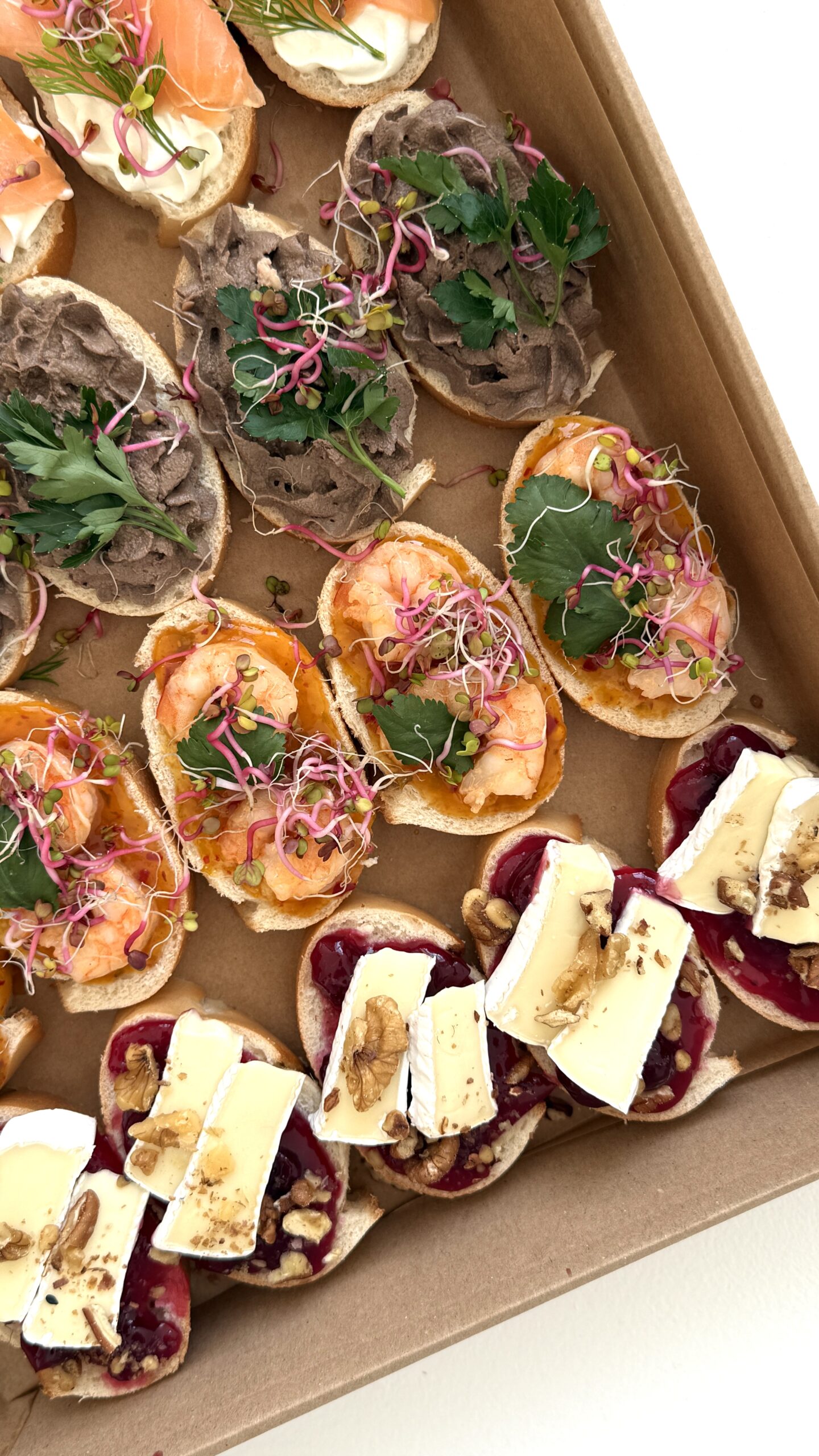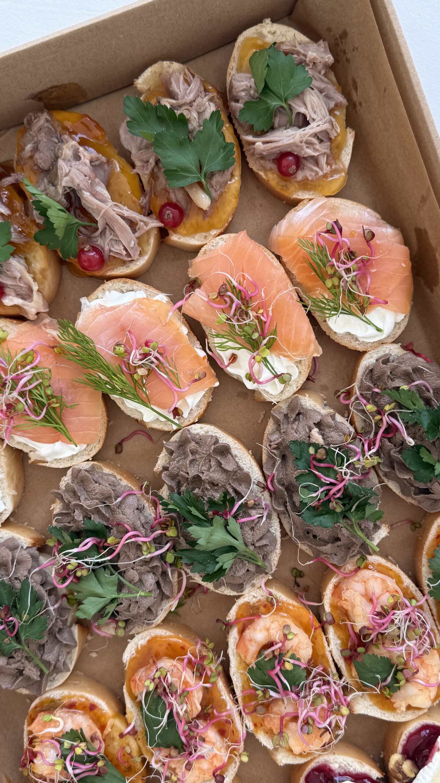 Mini Sandwich Box 4 to elegancki zestaw mini kanapeczek, który doskonale sprawdzi się jako nowoczesny catering na eventy, spotkania firmowe oraz przyjęcia okolicznościowe. Dzięki starannie dobranym składnikom oraz estetycznemu podaniu box prezentuje się wyjątkowo efektownie, a jednocześnie zachwyca różnorodnością smaków. Każda kanapeczka została przygotowana z dbałością o detale, dlatego łączy w sobie świeżość, jakość i wyjątkowy wygląd.