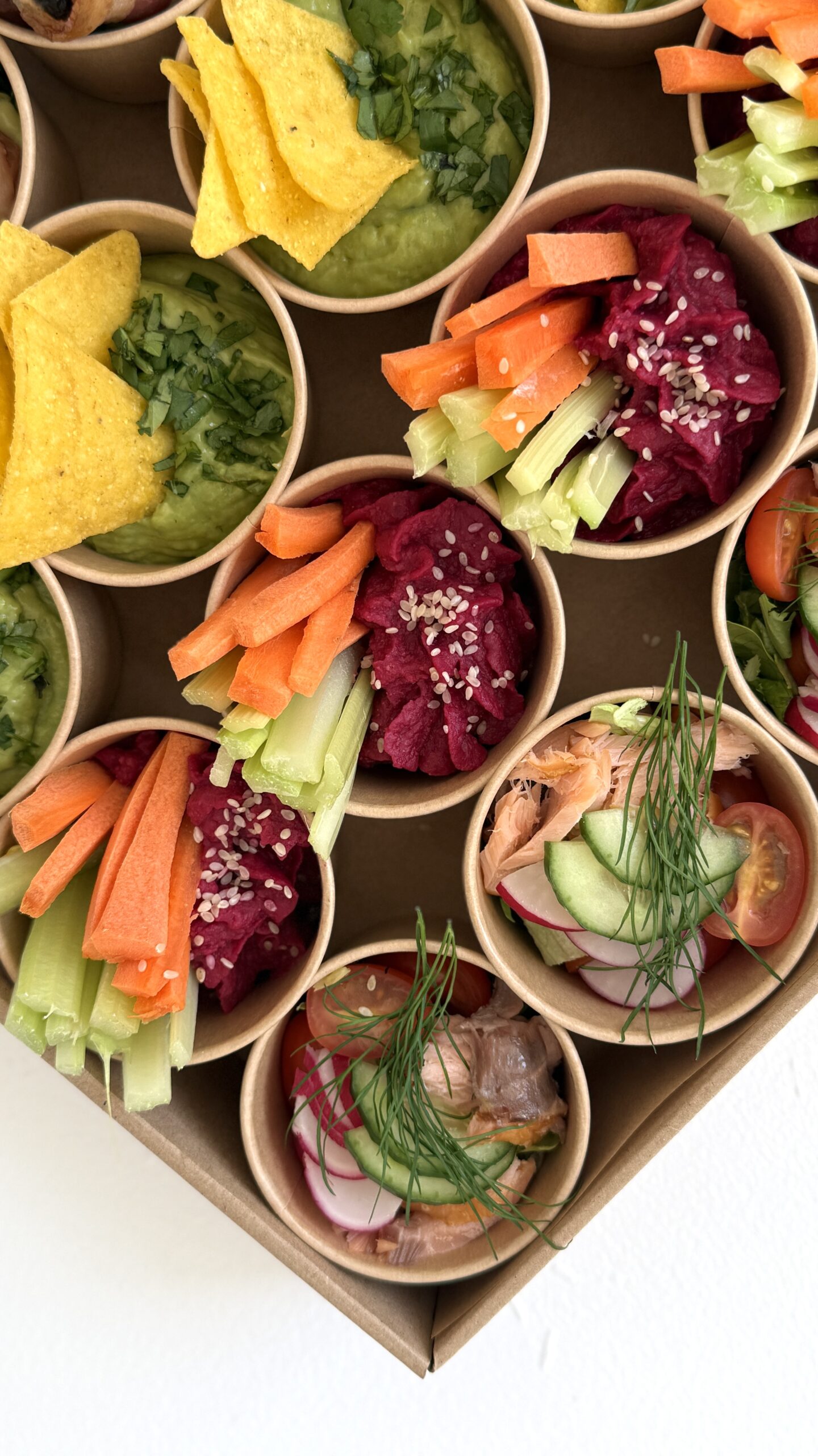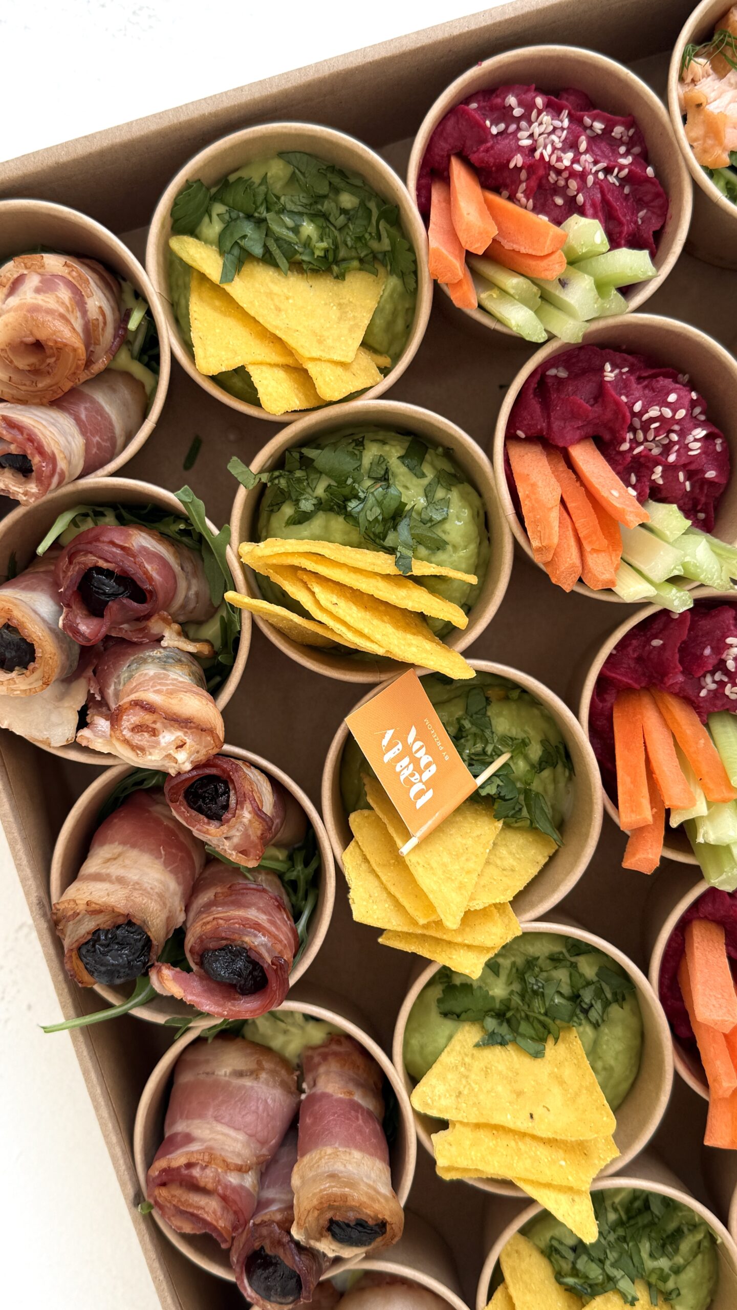 W zestawie znajdują się różnorodne przekąski serwowane w mini miseczkach, które łączą świeże warzywa, aromatyczne dodatki oraz wyraziste smaki. Znajdziesz tu między innymi: